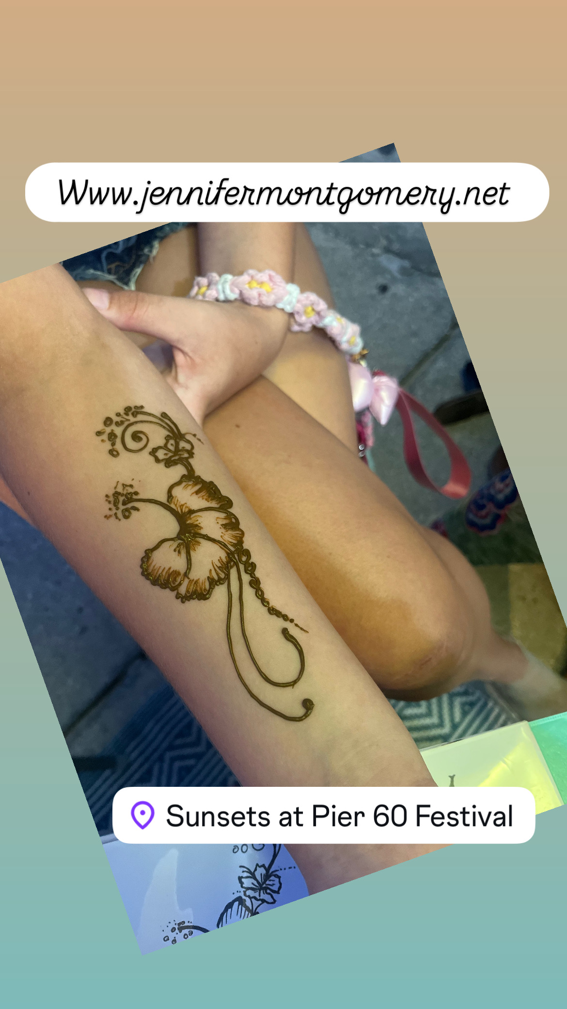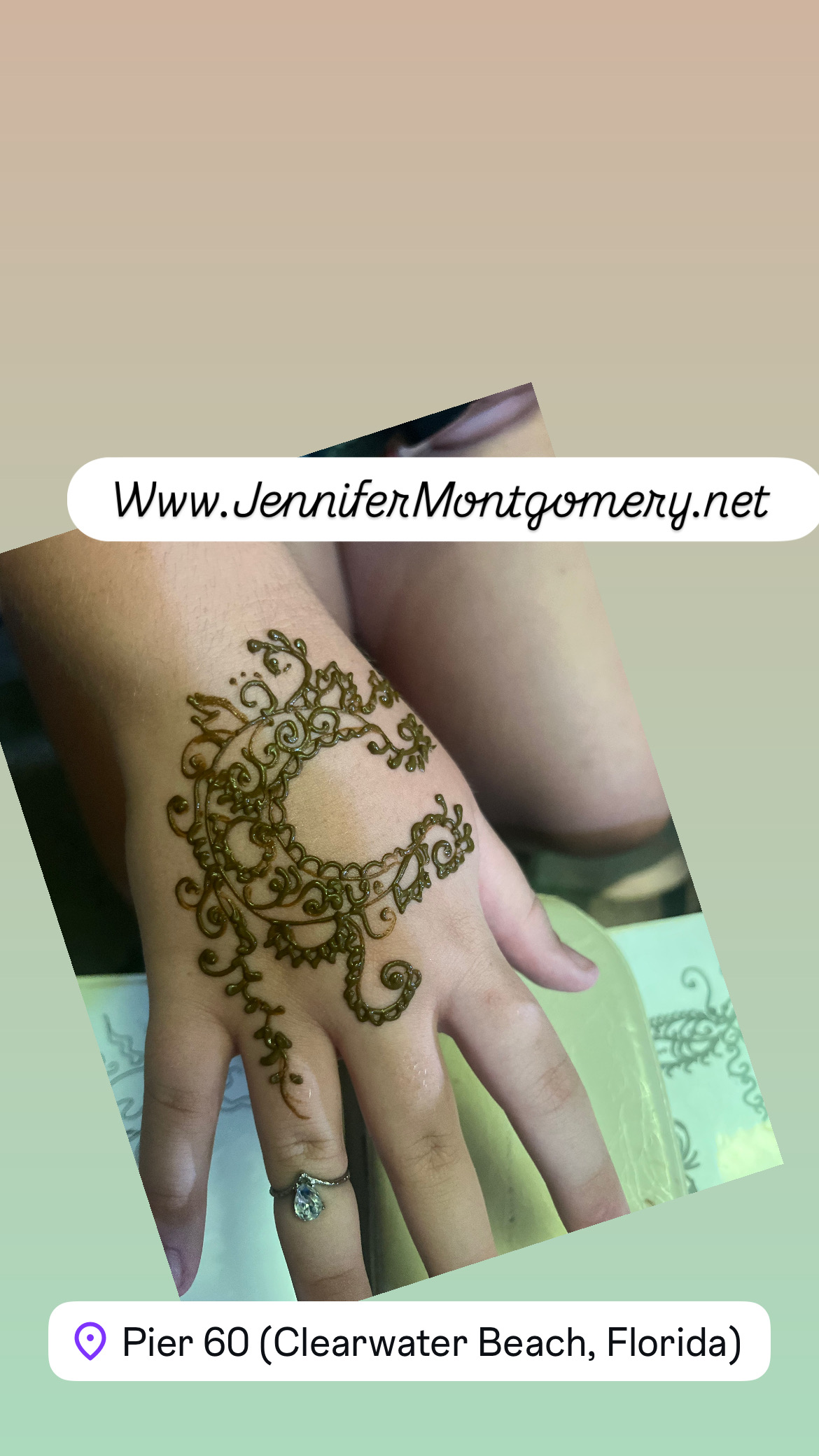 Get your henna body art designs by henna artist Jennifer Montgomery at Pier 60 in Clearwater Beach at Sunset! Contact for more info call/ text 610.764.0853